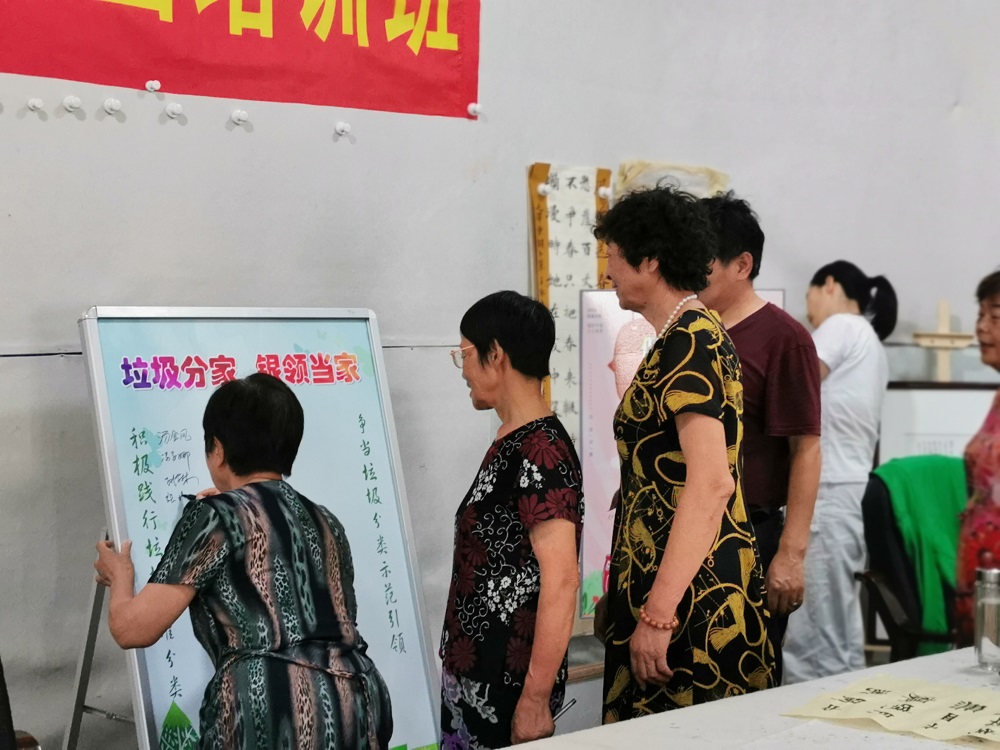 宣讲结束后,焦淑明校长与老年书法班学员们在“垃圾分类·银领当家”倡议板上签下了自己的名字,学员们均表示:积极践行垃圾积极分类,争当垃圾分类示范引领。