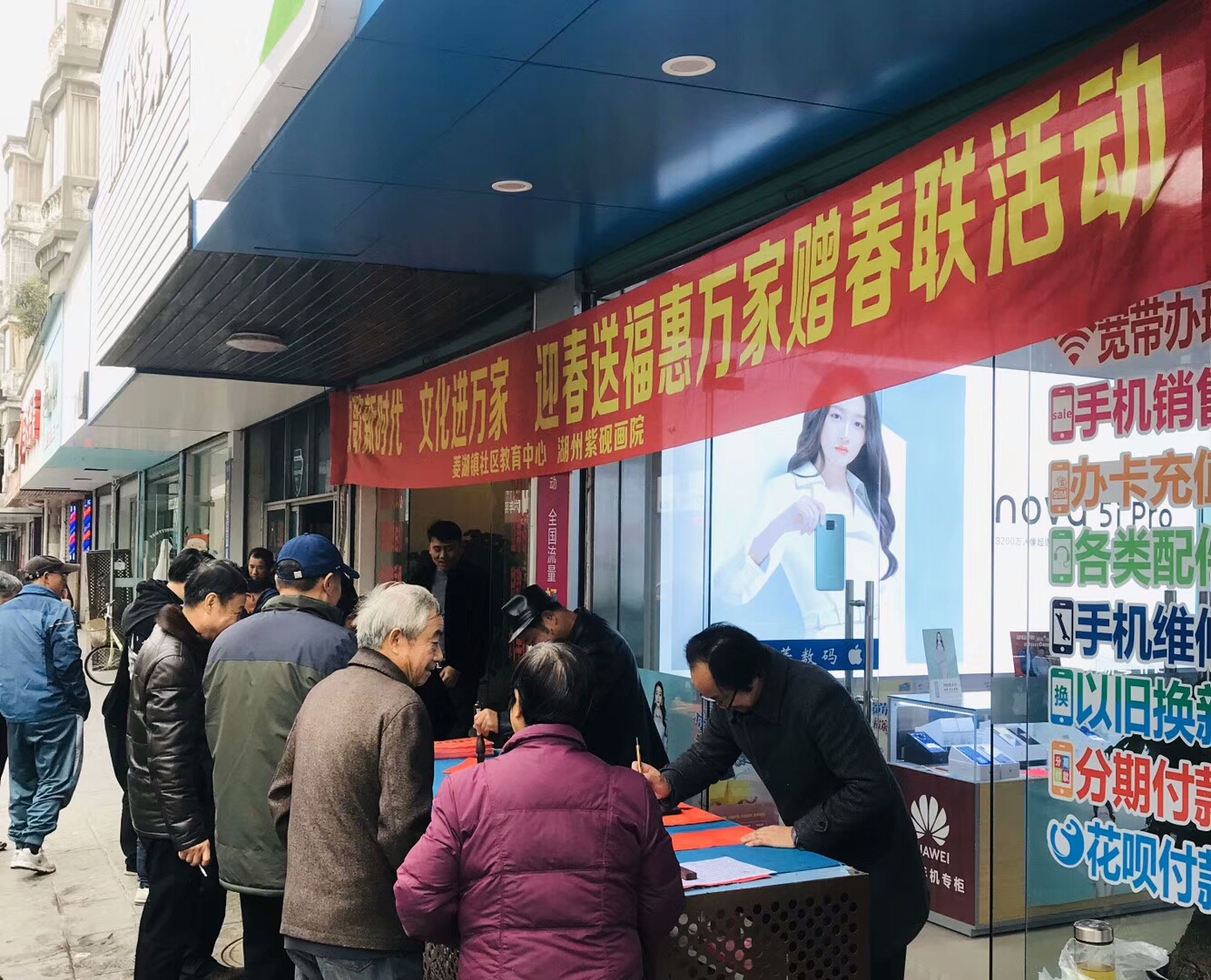 新年临近,为进一步弘扬中华传统文化,丰富菱湖镇居民群众文化生活,营造和谐美满的节日氛围,菱湖镇社区教育中心与湖州紫砚画院于近日在菱湖镇梦湖街联合开展了“放歌新时代 文化进万家”迎春送福惠�f家赠春联活动。