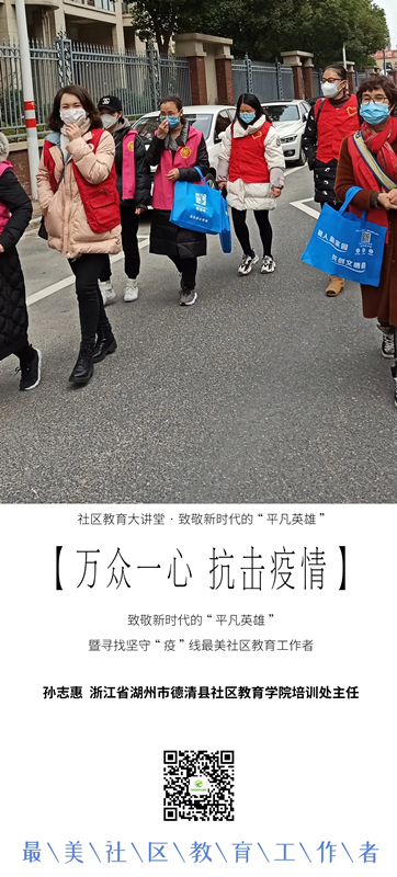 孙志惠是德清县社区教育学院的一名党员教师,在2020年新型冠状病毒爆发期间,她第一时间报名参加了县教育系统招募的志愿者服务工作。