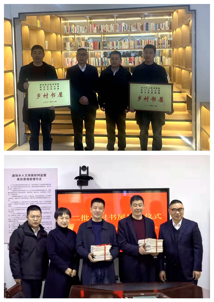本次乡村书屋建设惠及道场乡菰城村和施家桥村,根据农户需求,选购政策法规、农业生产、养殖种植、文化休闲、卫生保健等2276册书籍,高标准打造农村基层书屋。授牌仪式上,学校图书馆馆长张合营指出,建设农村书屋是一个很好的建设乡村农民文化提高精神文明建设很好的举措,我们可以充分地将高校自身图书资源,更好地运用到乡村振兴中去,为农村农民提供更好的精神食粮。