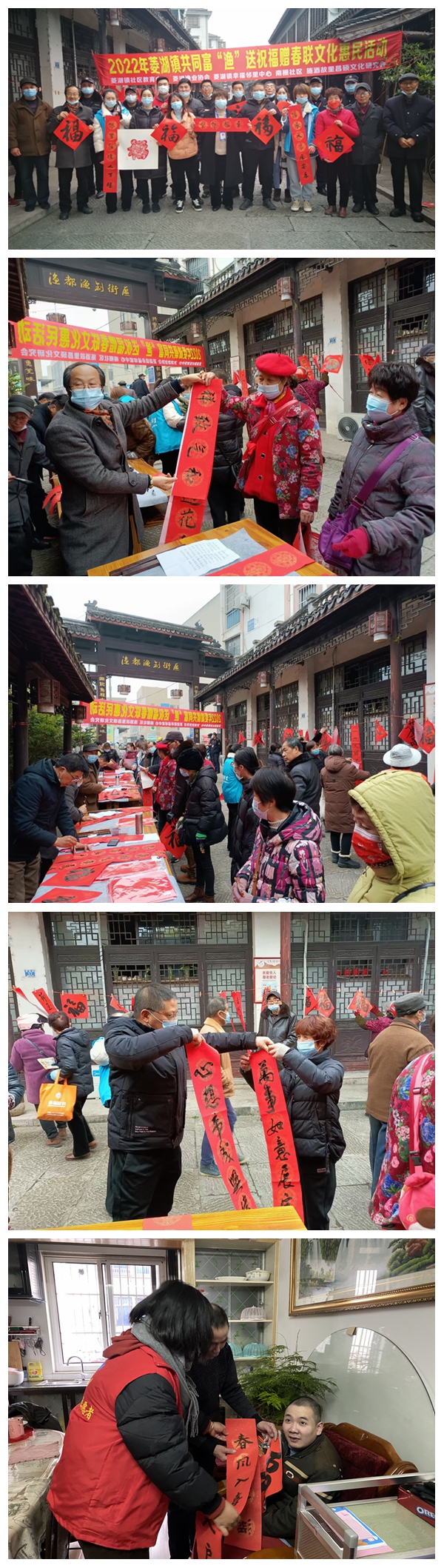 2022年1月10日上午,菱湖镇社区教育中心与菱湖渔业协会、菱湖镇幸福邻里中心、菱湖镇南栅社区、南浔区施酒故里昌硕文化研究会组织菱湖镇老年大学书画班学员、菱湖镇紫砚书画院书画家、菱湖镇老干部党员、菱湖镇社区及菱湖幸福邻里中心志愿者二十余人在菱湖镇渔都渔创街区联合开展2022年共同富“渔”送祝福赠春联文化惠民活动,把满满的关怀、浓浓的年味、新春的祝福送到千家万户,活动现场开展“迎新春、送温暖”暨疫情防控知识宣传活动,为群众送去党和政府的关怀和新春的祝福,拉开2022年虎年春节送福送春联送温暖公益活动序幕。