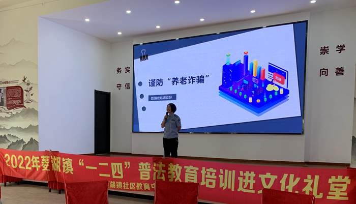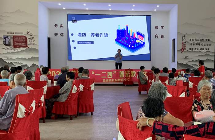 为进一步提高农村老年人对各类诈骗方式的鉴别能力和自我防范意识,6月20日下午,菱湖镇社区教育中心在卢介庄村文化大礼堂开展了“一二四”普法教育,邀请了菱湖镇派出所警员王佳佳以“老年人的防诈骗和防溺水知识”为主题,为卢介庄村的老年人上了一堂别开生面的防诈骗和防溺水知识课,有83位老年人参加了此次活动。