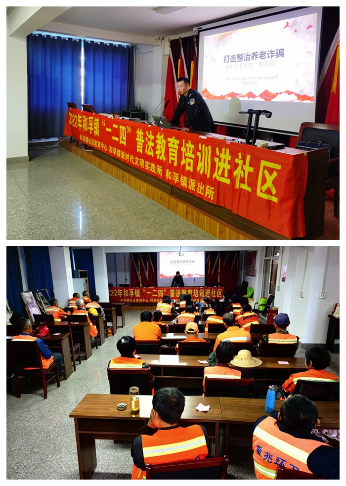 2022年10月12日下午,和孚成校联合和孚镇派出所应邀走进重兆社区,宣讲员孙晨为重兆社区所有环卫工人和社区委员会成员带来了一场以交通法规教育为主题的普法宣传活动。