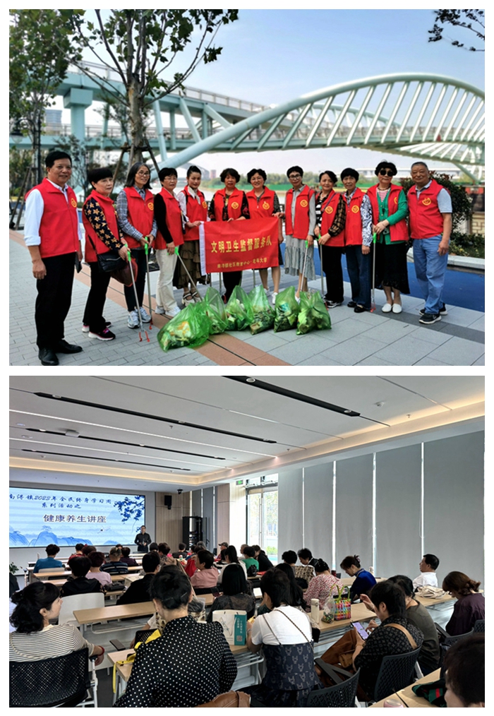 启动仪式上,�E塘社区书记、主任施域涵首先对大家的到来表示欢迎,然后简要介绍了�E塘未来社区智能化打造与建设。接着,南浔成校曹晓明校长向大家介绍了开展全民终身学习周的意义及丰富的活动内容。启动仪式后,老年学校学员代表聆听了南浔区中医院老年科张志辉医生带来的健康养生讲座,张医生给大家介绍了秋季食疗和养生的方法。讲座结束后,银龄志愿者们在南浔镇老年学校临时党支部的带领下开展了志愿服务活动,活动分三大组进行:一组进入泰安路沿街店铺与附近小区发放宣传资料,生动介绍了防诈小知识和老年人健康生活指南等;二组对�E塘沿河一带公园与草坪里进行了垃圾的清理;三组在�E塘社区为老服务中心手把手为有智能手机的老年人介绍了“浙学通”的学习与使用。