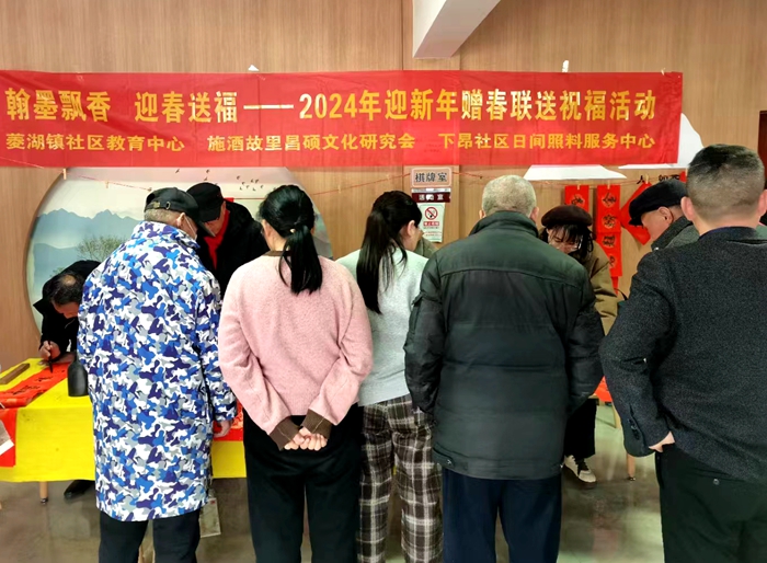 新春佳节临近,为进一步弘扬中华传统文化,丰富民群众文化生活,营造和谐美满的节日氛围。2023年1月23日下午,菱湖镇社区教育中心、施酒故里昌硕文化研究会、下昂社区日间照料服务中心联合在菱湖镇下昂社区举办了“翰墨飘香 迎春送福”——2024年迎新年赠春联送祝福活动。