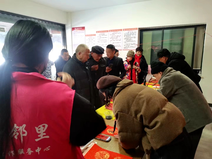 新春伊始,家家户户都要精选一幅大红春联贴于门上,以示辞旧迎新。春联以对仗工整、简洁精巧的文字描绘美好形象,抒发来年美好的愿望,为节日增加喜庆气氛。此次活动意在让更多居民体味到中华传统文化习俗的魅力,更增进了和谐幸福的邻里之情。