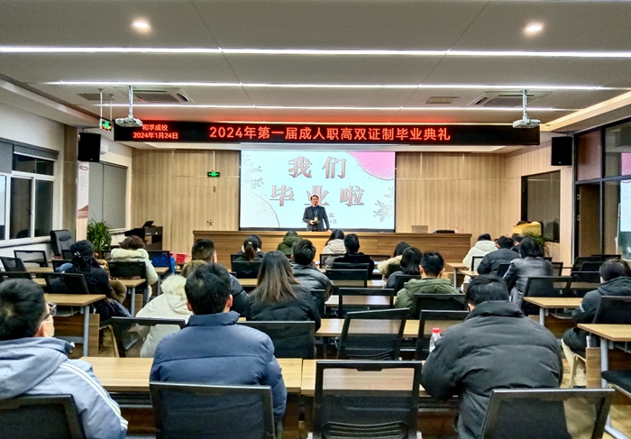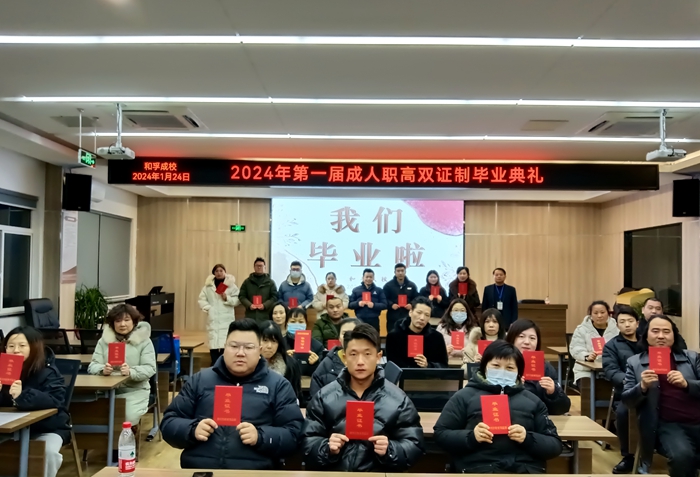2024年1月24日晚上,和孚成校举行2024年第一届双证制成人职业高中毕业典礼,53名毕业学员参加了此次活动。