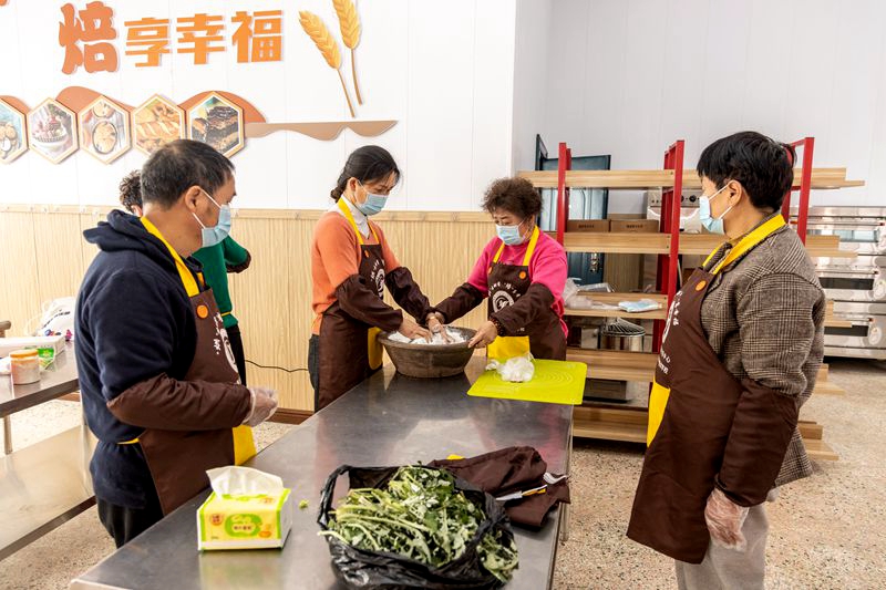 第二阶段:快乐烘焙活动。制作时令甜品——甜麦塌饼。在面点老师的指导下,大家摩拳擦掌,纷纷上阵,剁草、揉面、分面团、搓剂子、上蒸屉、煎面饼……在大家齐心协力的合作下,一个个清香焦黄的甜麦塌饼新鲜出炉。品尝着自己亲手制作的甜麦塌饼,笑容溢满每个人的脸,大家都感受到大家庭的温暖。