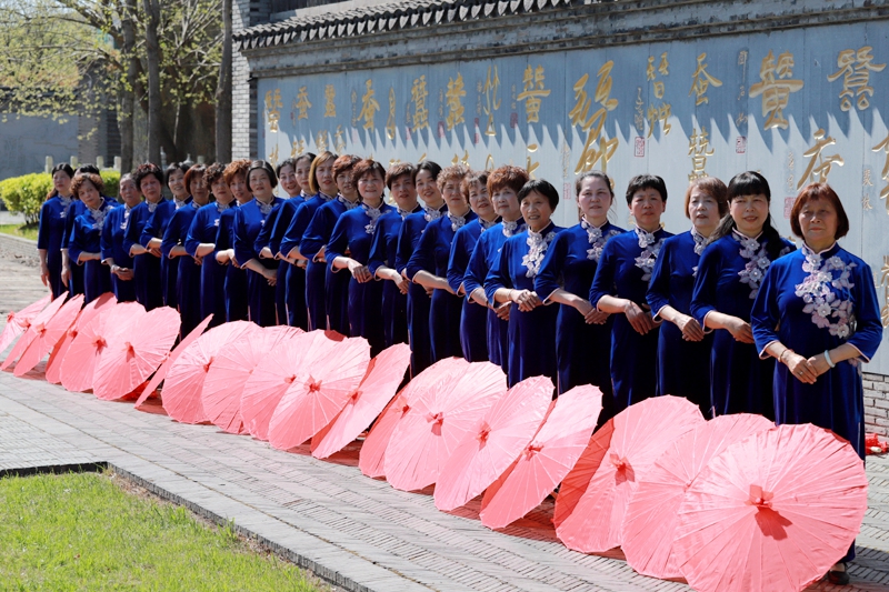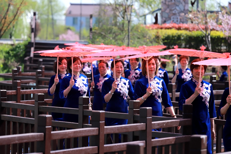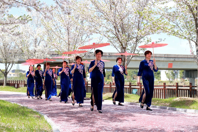 活动现场,石淙镇老年学校二十六名身着统一旗袍的老年人,在樱花的映衬下,优雅整齐地走在花园路径间。老人们或款步而行,或轻盈转身,或低眉含笑,每一个动作都显得那么从容不迫,那么优雅大方。他们的笑容在樱花的映衬下显得格外灿烂,仿佛回到了那个风华正茂的年代。