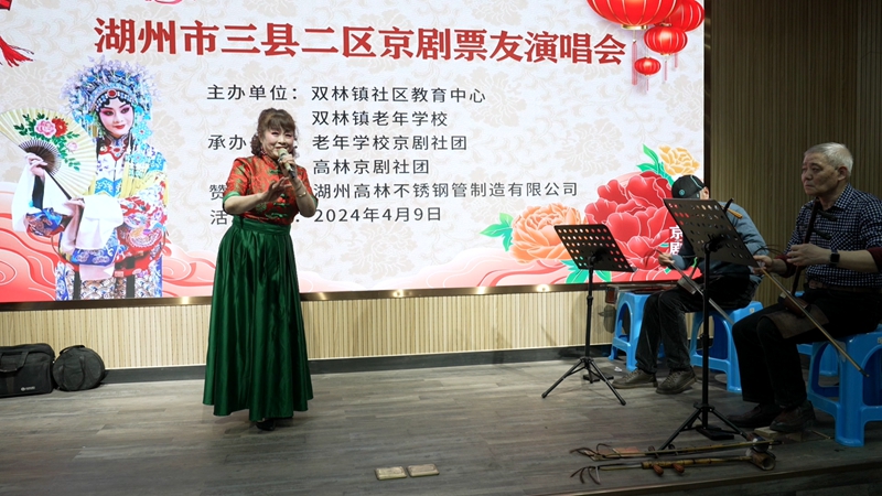 4月9日,一场精彩纷呈的京剧票友会在双林成校举行。此次票友会由双林镇社区教育中心、双林镇老年学校主办,汇聚了来自湖州市三县两区热爱京剧艺术的票友们,他们齐聚一堂,向观众展示了京剧艺术的魅力和风采。