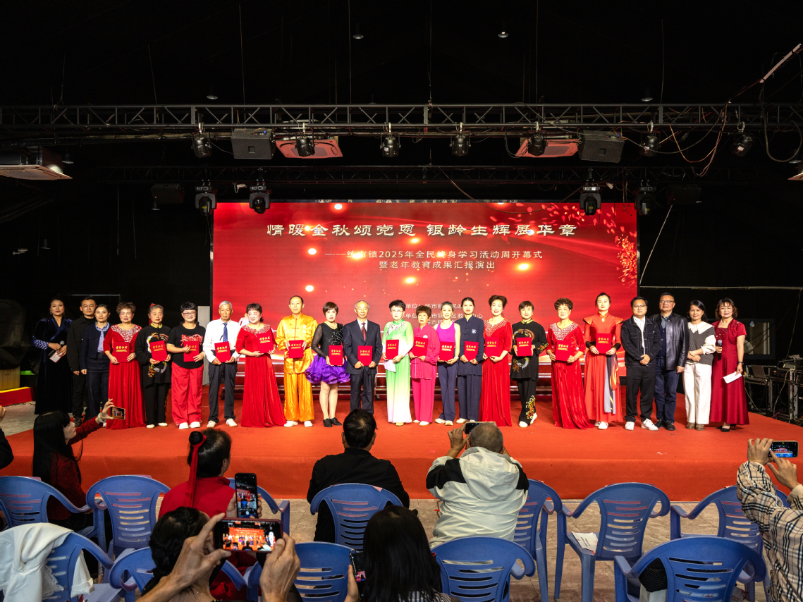 金秋送爽,丹桂飘香。11月4日下午,由练市镇人民政府主办,练市镇社区教育中心、老年学校、总工会、综合文化站等单位协办的“情暖金秋颂党恩 银龄生辉展华章”——练市镇2025年全民终身学习活动周开幕式暨老年教育成果汇报演出,在练市镇布谷里大剧场隆重举行并圆满落幕。